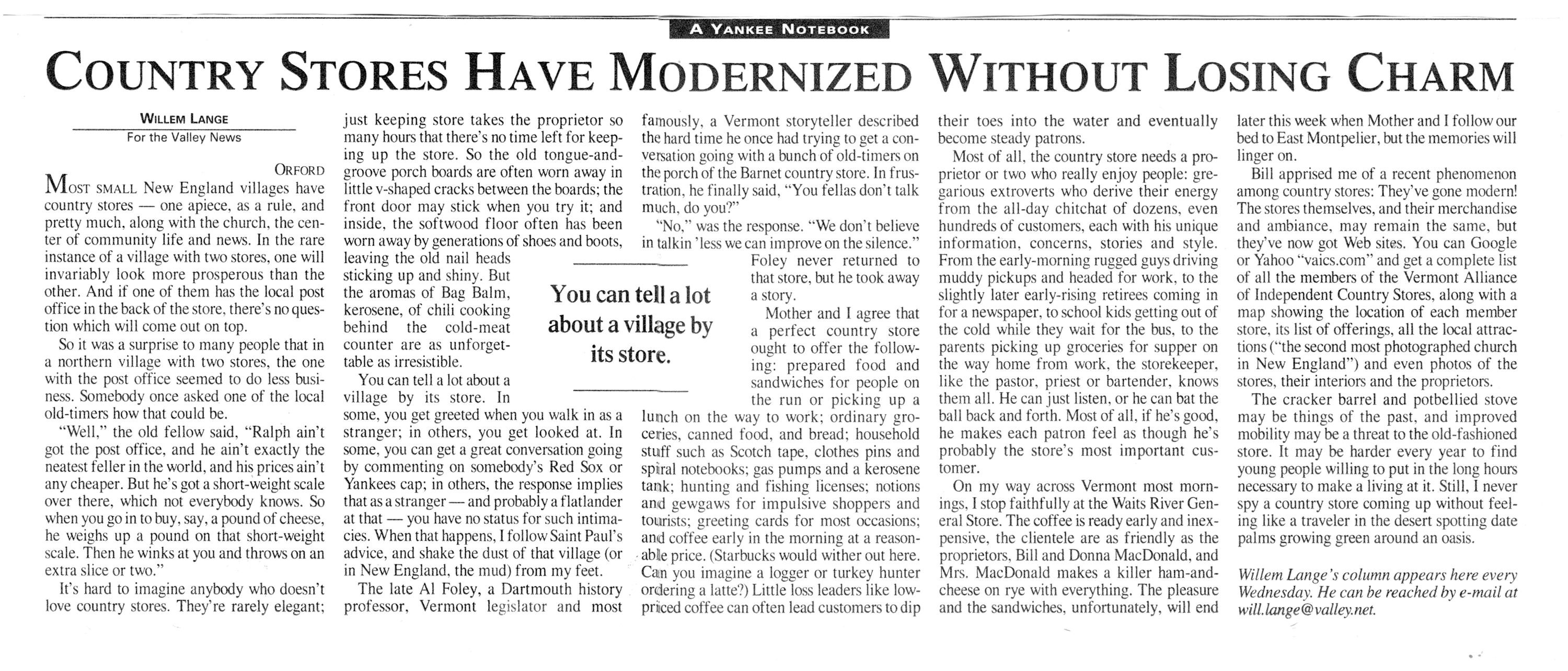 Read an article by Willem Lange that mentions the Waits River General Store